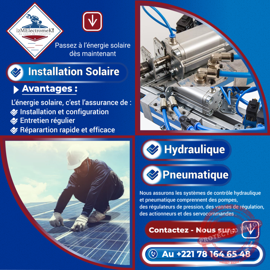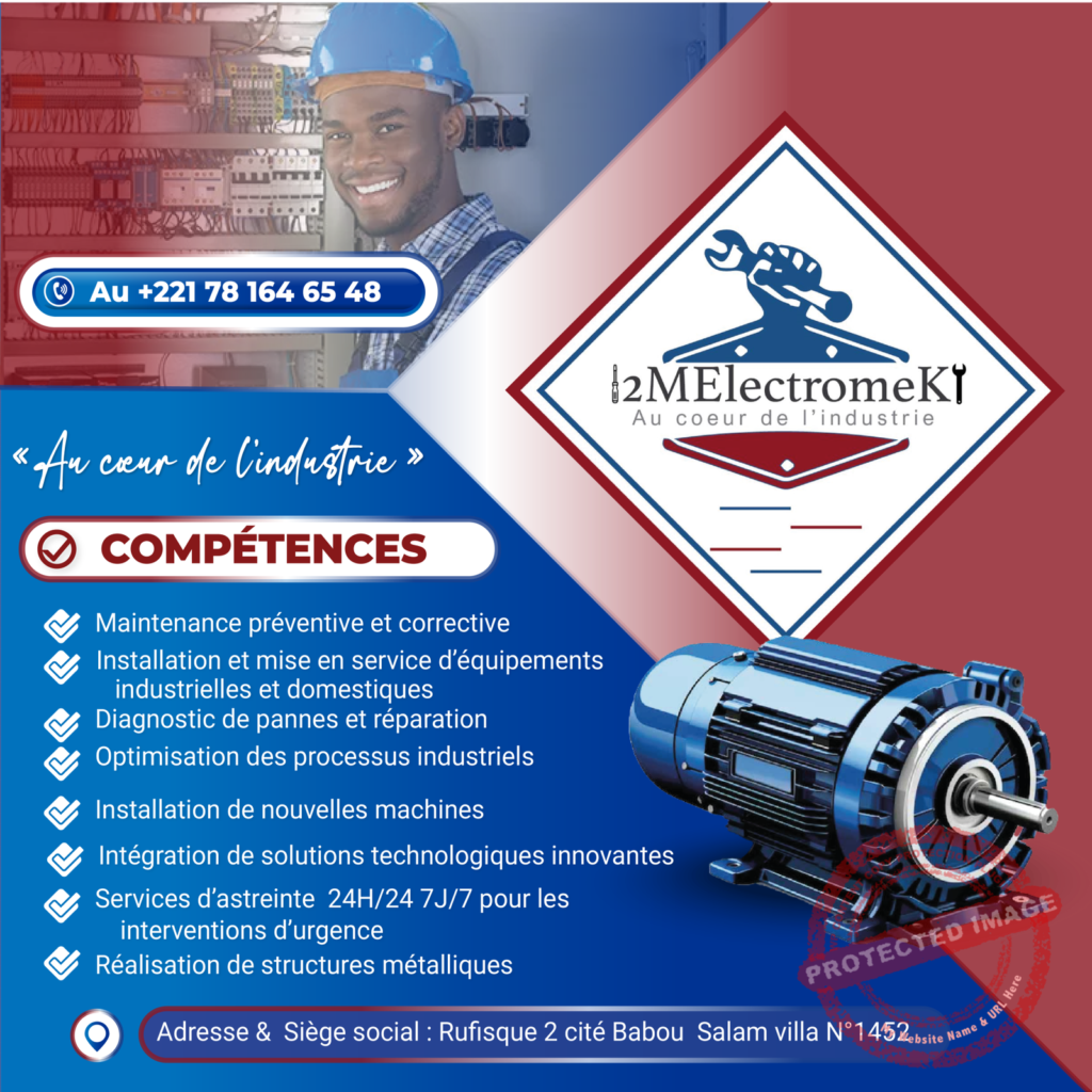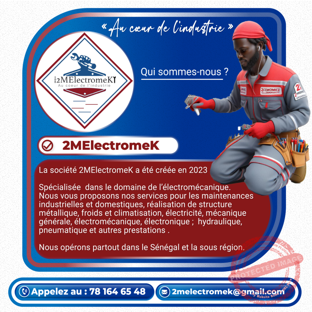 La société 2MElectromeK a été créée en 2023. Spécialisée dans le domaine de l’électromécanique. Nous vous proposons nos services pour les maintenances industrielles et domestiques, réalisation de structure métallique, froids et climatisation, électricité, mécanique générale, électromécanique, électronique ; hydraulique, pneumatique et autres prestations. Nous opérons partout dans le Sénégal et la sous-région.